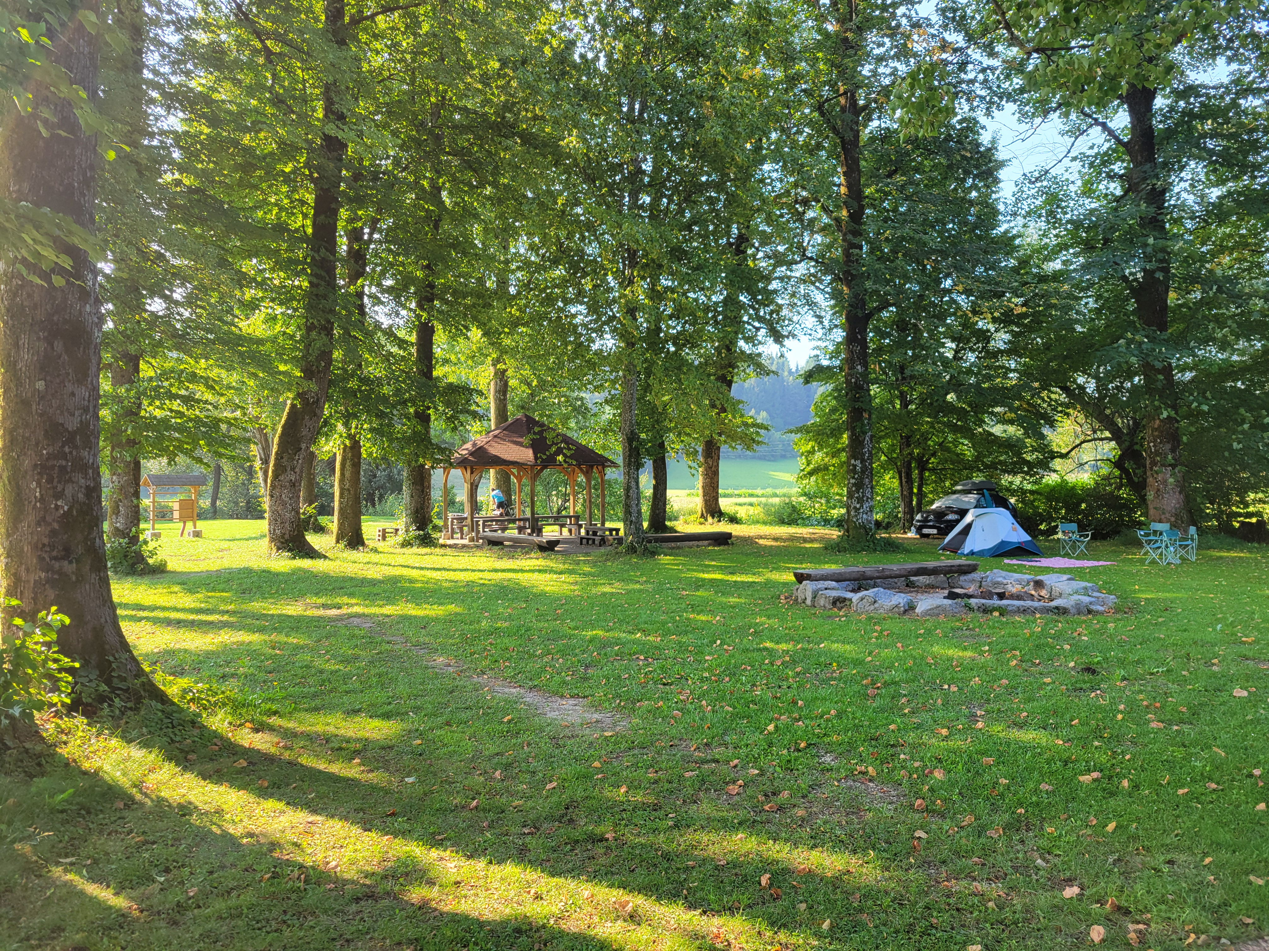 Am Morgen setzen wir uns noch an den Tisch am Zeltplatz oberhalb der Fläche für die Zelte. Zwei Radler sind noch da, die nicht gut geschlafen haben, weil die Zeltwiese so abschüssig war. Gut, dass wir uns anders entschieden haben und einen „normalen“ Stellplatz genommen haben.