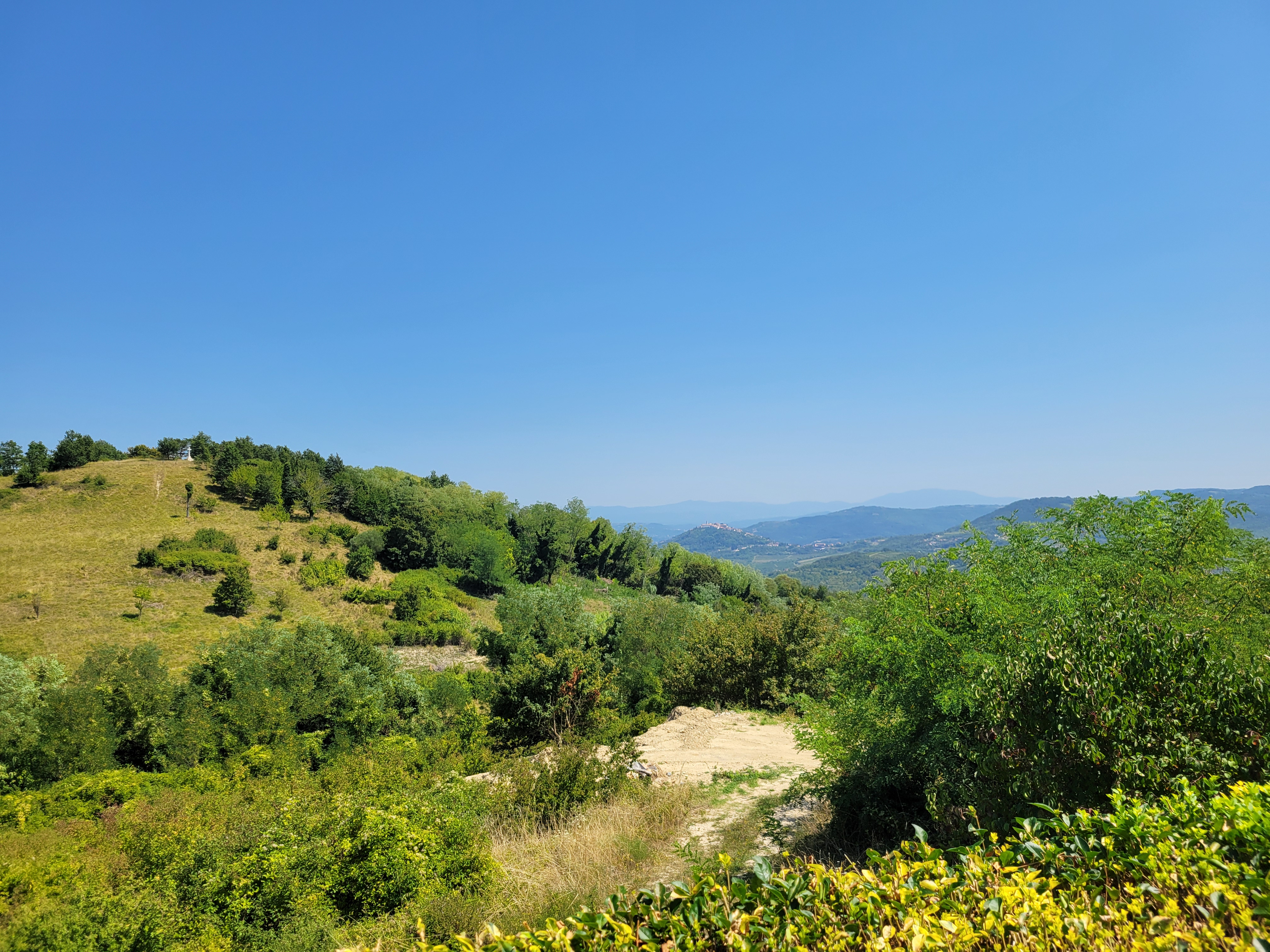 Es gab eine alte Bahnstrecke von Rovinj zu einem Nachbarstädtchen, die man seit 2019 nun mit dem Rad befahren kann. Allerdings ist sie auch nur geschottert, was es für uns mit den bepackten Rädern nicht gerade leicht macht, wenn der Schotter nicht gut befestigt ist. Wir machen uns am Vormittag auf die kleine Reise, steigen die ersten Höhenmeter an und biegen nach einem Vorschlag von Komoot auf einen kleinen Radweg ab. Er beginnt zwar schon gleich mit Schotter, doch der ist gut fahrbar - und beginnt bald, steil abzusteigen.