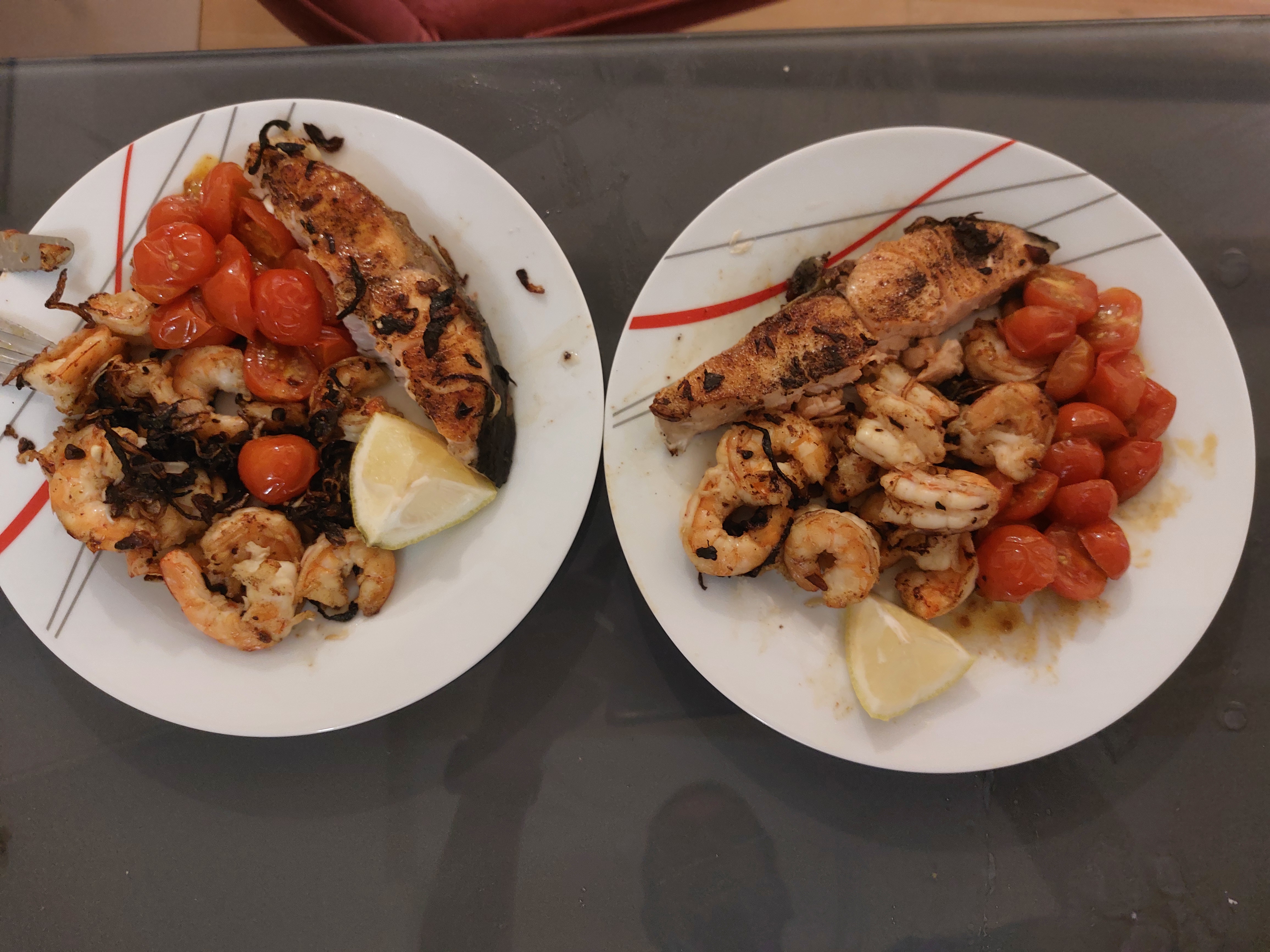 Wir finden in Vrsac eine Unterkunft und ich schreibe an den Zeltplatz in Triest für die Übernachtung von Samstag auf Sonntag. Dann machen wir uns ans Kochen, säubern die Shrimps, braten ein Stück Lachs und die Shrimps, etwas kleine Tomaten dazu: Ein tolles Abendessen.