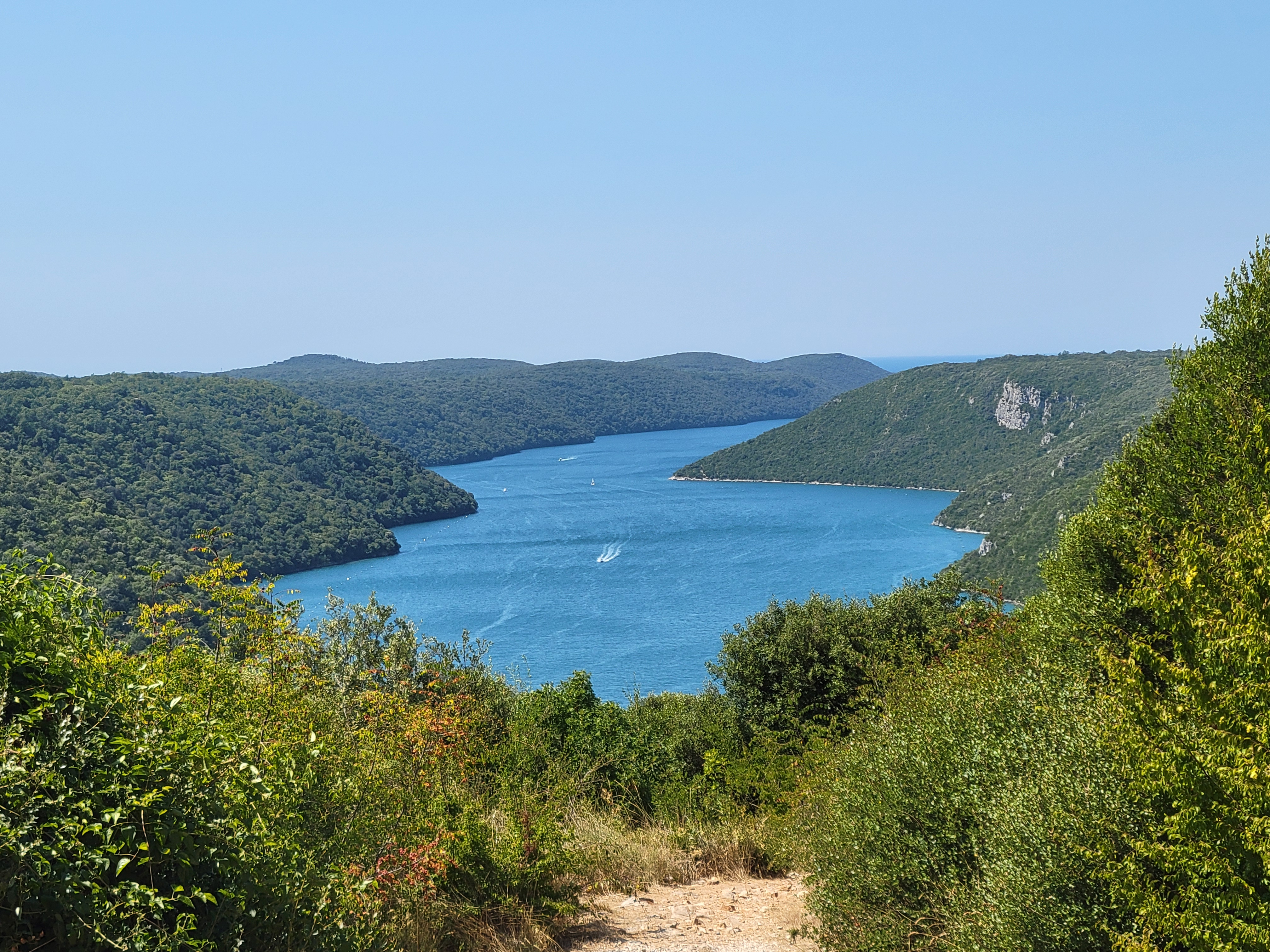 Von der Straße vom Lim-Fjord aufwärts gab es einen Hinweis auf einen Radweg, dem nun auch ein paar Männer von unten gefolgt sind: Ohne Gepäck schaffen sie es trotzdem nicht, dem steilen Anstieg zu folgen; sie müssen schieben. Als wir wieder auf der Straße sind, ist klar: Wir rollen gemächlich auf Asphalt nach unten, wo wir uns auf einen Abstecher zum Ende des Lim-Fjordes einigen. Dort gibt es wieder den spät-morgendlichen Cappuccino mit Blick auf den Fjord. Ich entdecke eine asphaltierte Auffahrt, die uns schon mal 1/3 der Steigung nach oben bringen kann. Ganz oben biegen wir von der größeren Hauptstraße nach/von Rovinj ab auf eine kleinere und im ersten Dorf nochmals. An einer Waldlichtung machen wir Pause, werden von Wespen und Mücken jedoch bald wieder vertrieben. Am Eingang von Vrsar müssen wir feststellen, dass heute, am 15.08., die Läden zuhaben: Es ist Maria Himmelfahrt.