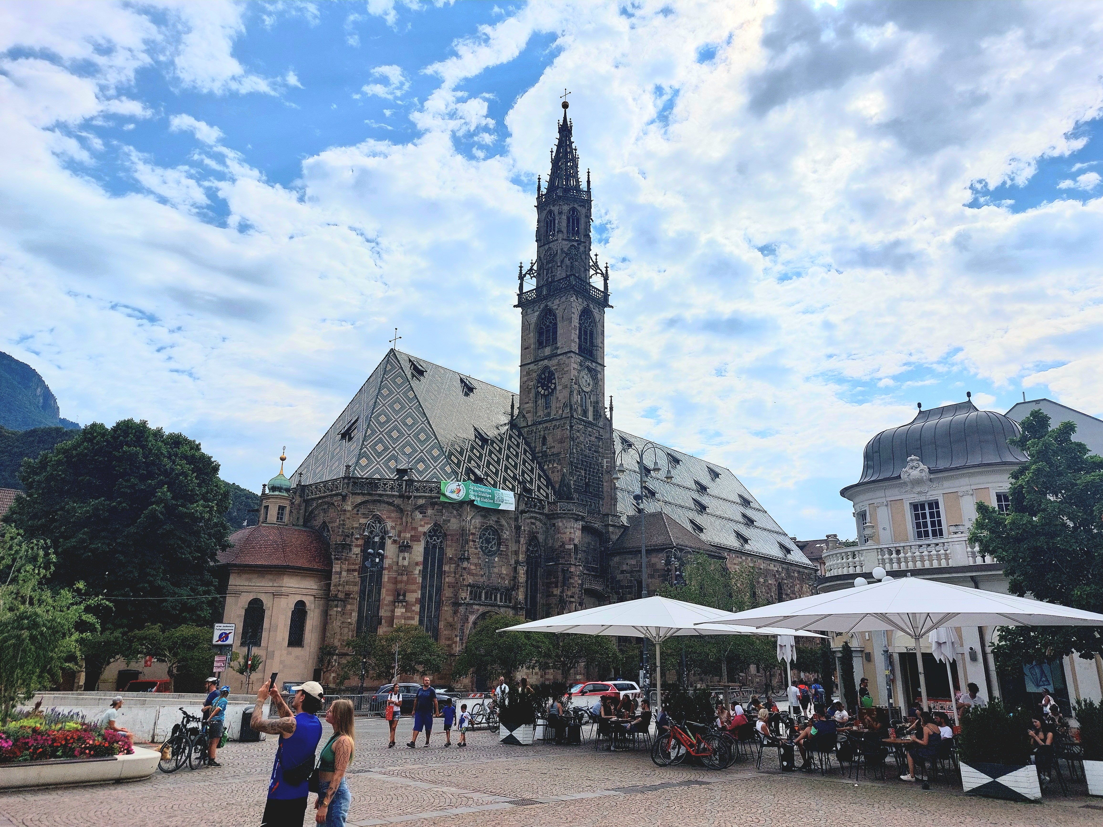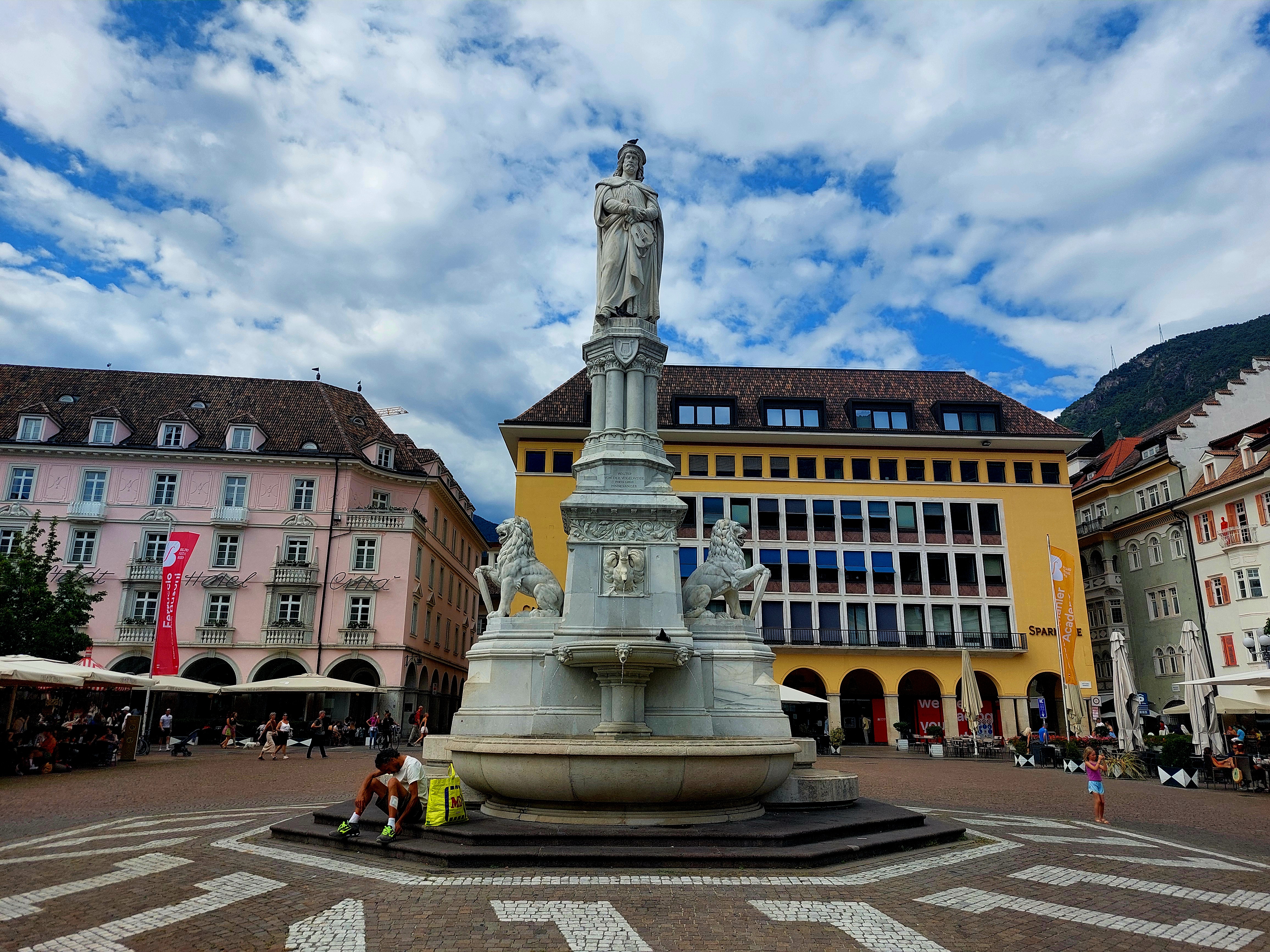 Wir fahren zunächst etwas nach Bozen rein, auf einen Platz mit einem großen Denkmal für Walther von der Vogelweide: Das haben sie Ende des 18. Jhs. gebaut, weil man damals dachte, er hätte was mit Südtirol zu tun. Witzig fand ich, dass man einige Jahre später ein anderes, nicht so „deutsch“ anmutendes Denkmal für Dante baute und dann, ab den 1930er Jahren, das Walther-Denkmal von diesem Platz weg und auf einen anderen, weniger bedeutsamen Platz gestellt hat. Wie das ging, das gut 10 m hohe Denkmal mit einem Brunnen unten dran? Jedenfalls dauerte es dann wieder einige Jahre, bevor das Denkmal in den 1980er Jahren wieder zurück kam.
