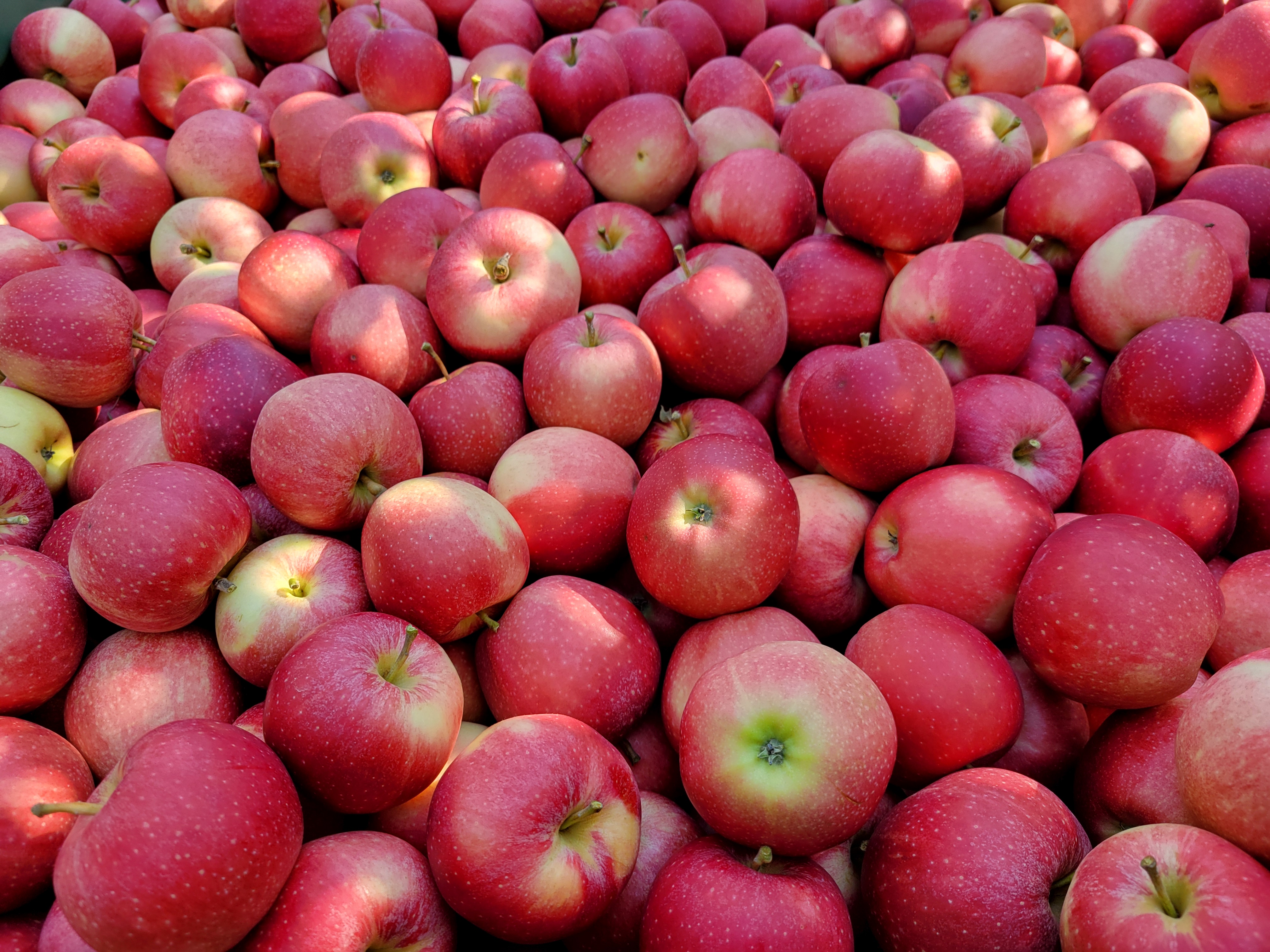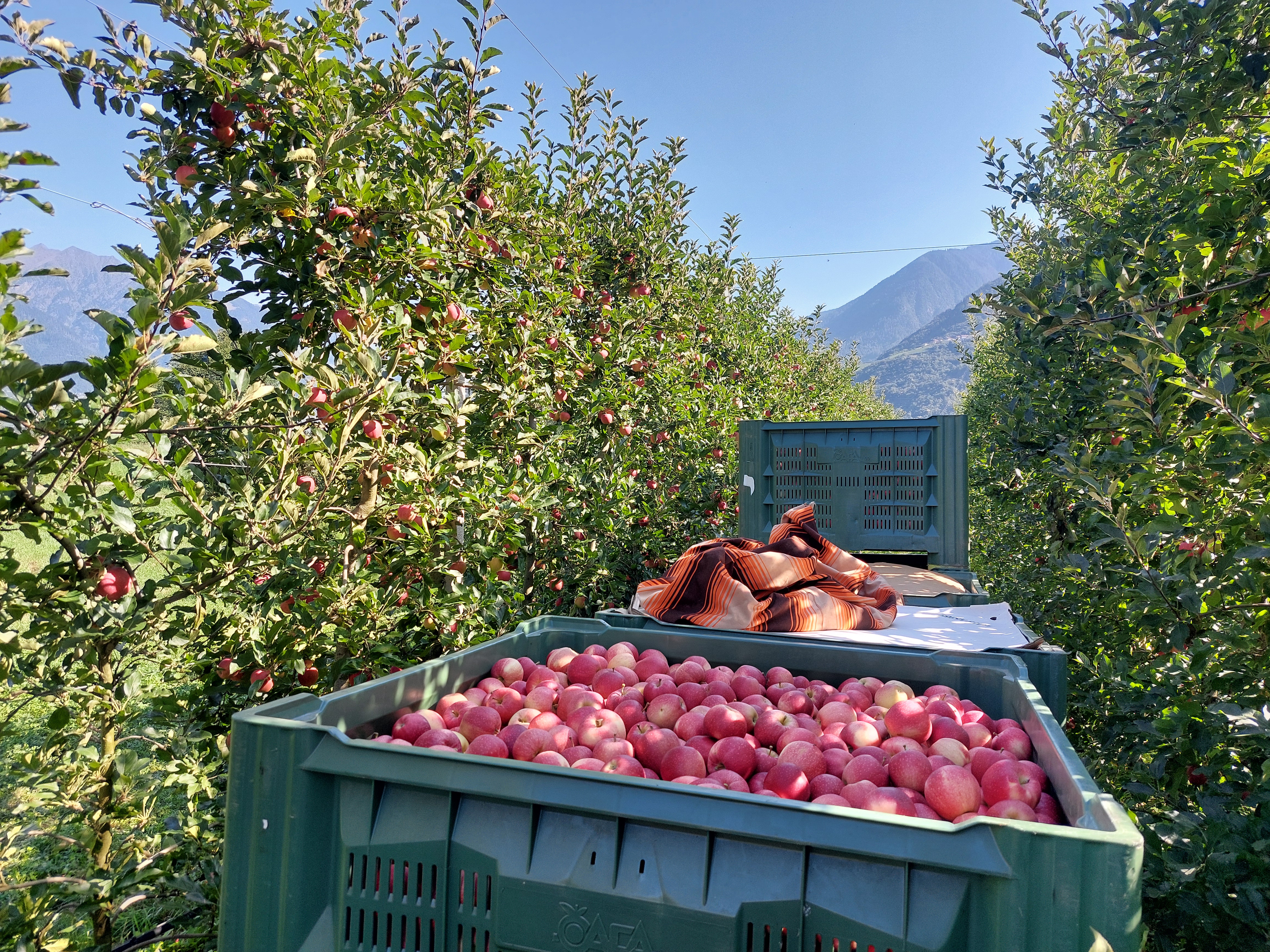Wir holen die leckeren Südtiroler Semmeln und brechen auf, solange es noch nicht so heiß ist. Wir kommen gut voran; Birgit will noch ein Foto machen von der Obst-Ernte, doch das dauert, weil wir nun zwischen Fluss und Bahnlinie fahren - erst nach einigen Kilometern ändert sich das und dann gibt es einige freundliche Männer, die uns auch noch wirklich schmackhafte Äpfel schenken.