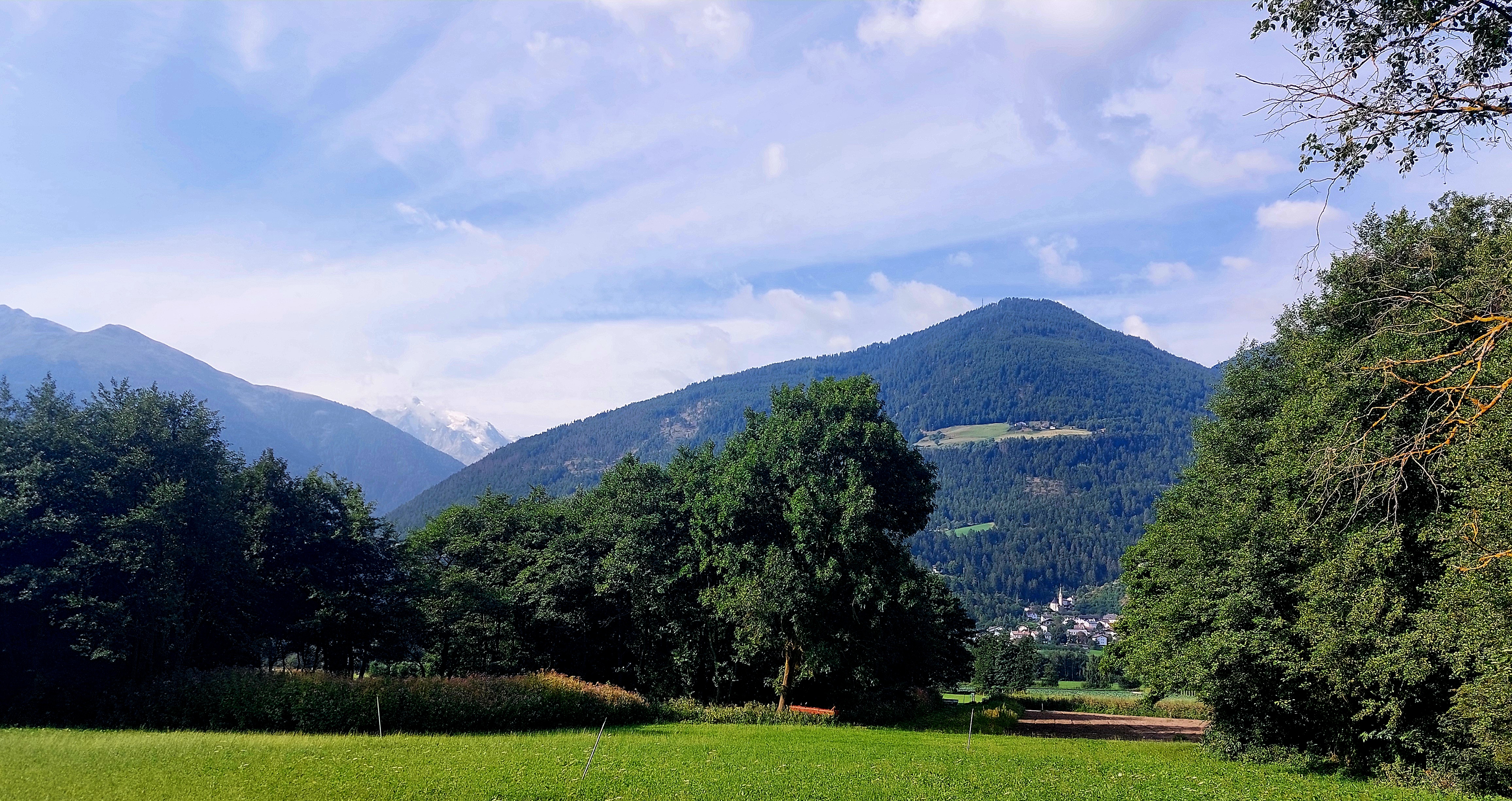Es dauert einige Zeit, bis wir uns orientiert haben, was die Fahrtrichtung betrifft: Wo ist das Pustertal, das wir zunächst befahren? Es geht langsam aufwärts, teils stärker als die Bundesstraße (und die Autobahn, die es hier auch wieder gibt, von der wir aber meist ein gutes Stück entfernt fahren). Nur ein kleines Stück fahren wir auf der Bundesstraße, dann geht es wieder auf einen geteerten Radweg. Recht viele Radler sind unterwegs, mit uns und auch talabwärts. Da ich dachte, die vielen Höhenmeter würden dazu führen, dass wir deutlich langsamer sind, sagte ich Birgit - die im Zug schon beim Campingplatz angerufen hat, nachdem die übersehen hatten, dass wir nur mit dem Rad kommen: Sie hätten erst ab 26.08. wieder was frei! -, wir könnten auch erst gegen 19 Uhr ankommen. Doch wir waren schon vor halb vier da. - Es gab noch einen kleinen Anstieg von der Pustertaler Straße hinauf und hinab, weil es da wohl keinen Radweg gab. - Erst später bemerke ich: Die Pustertaler Straße hat uns am Fluss Rienz entlang geführt - nicht an der Puster oder so ähnlich.