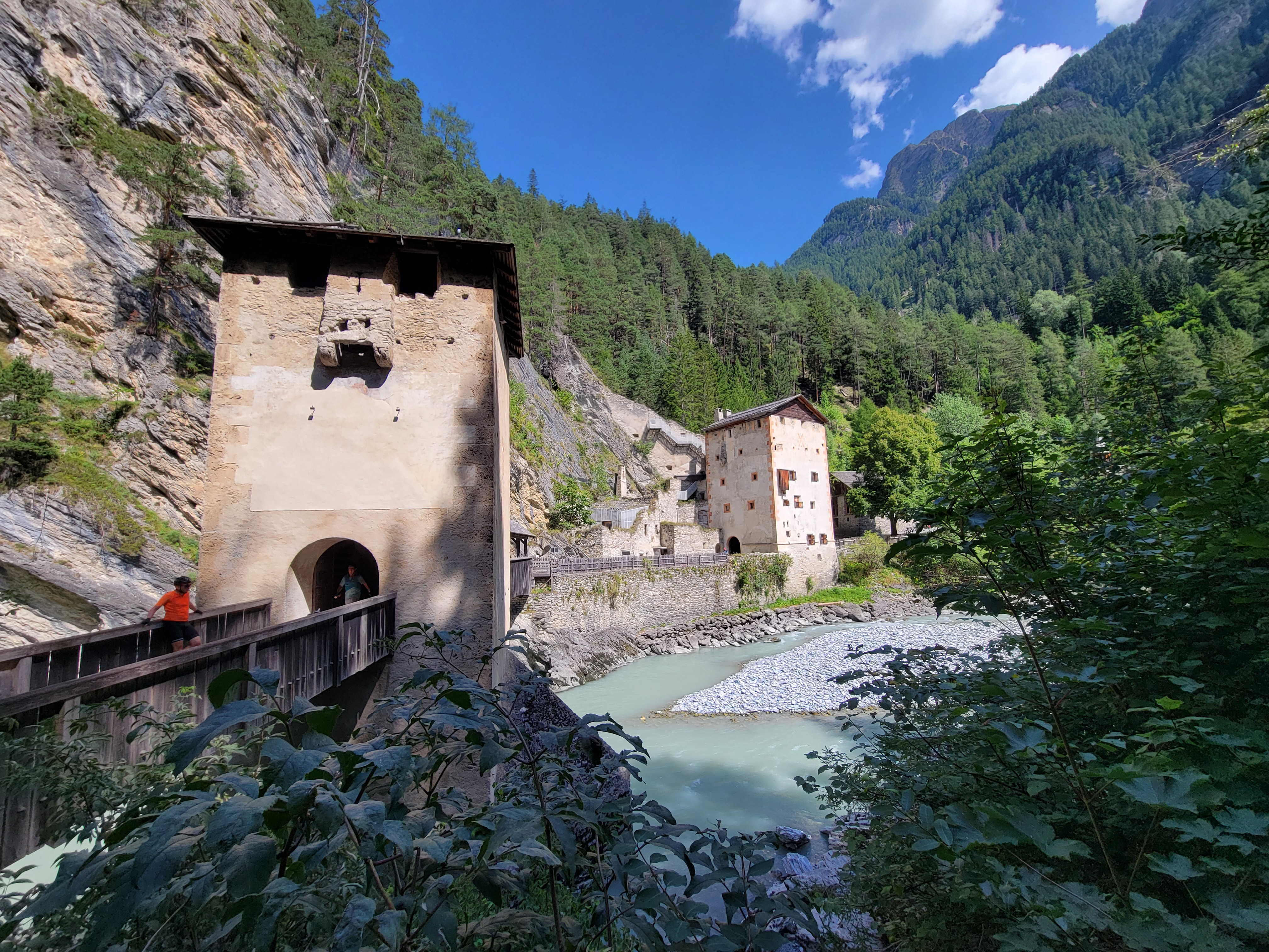 Kurz nach Reschen erreichen wir, ohne irgendein Signal, die Passhöhe - erst weiter unten kommt der Grenzübergang und wir sind wieder in Österreich. Wir folgen der Navigation von Komoot, landen auf einem geschotterten Weg, der steil abwärts führt - die Straße oben ist für Radler gesperrt. Wir fahren einen km hinab, kommen wieder auf die Straße, die uns bald in Überdachungen führt und sogar in mehrere Tunnel, die wir nun leider ohne Licht durchfahren müssen. Teils ist das durchaus kritisch, als mich etwa ein Bus überholt, der kaum Abstand hält. Ich bin froh, dass ich nicht lange warten muss am Ende, bis Birgit, ebenfalls gesund, aus dem Tunnel kommt. Es folgt ein steiler, weiterer Schotter-Abstieg bis nach Alt-Finstermünz. Da wäre eine Straße schon deutlich schöner gewesen! Dort gäbe es einen Kaffee, doch wir halten kurz für Fotos, weil es eine tolle Brücke ist an der alten kleinen Burg.