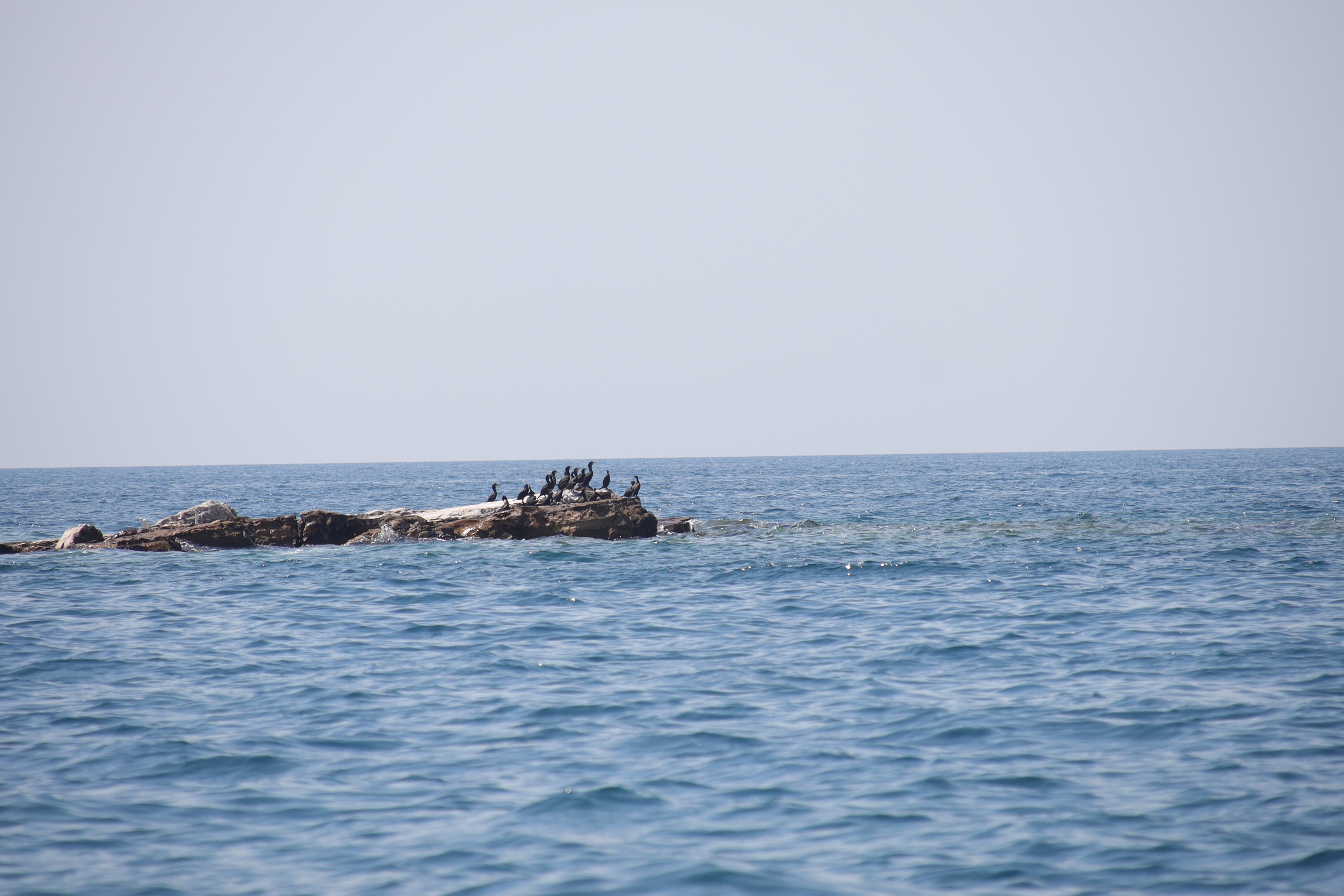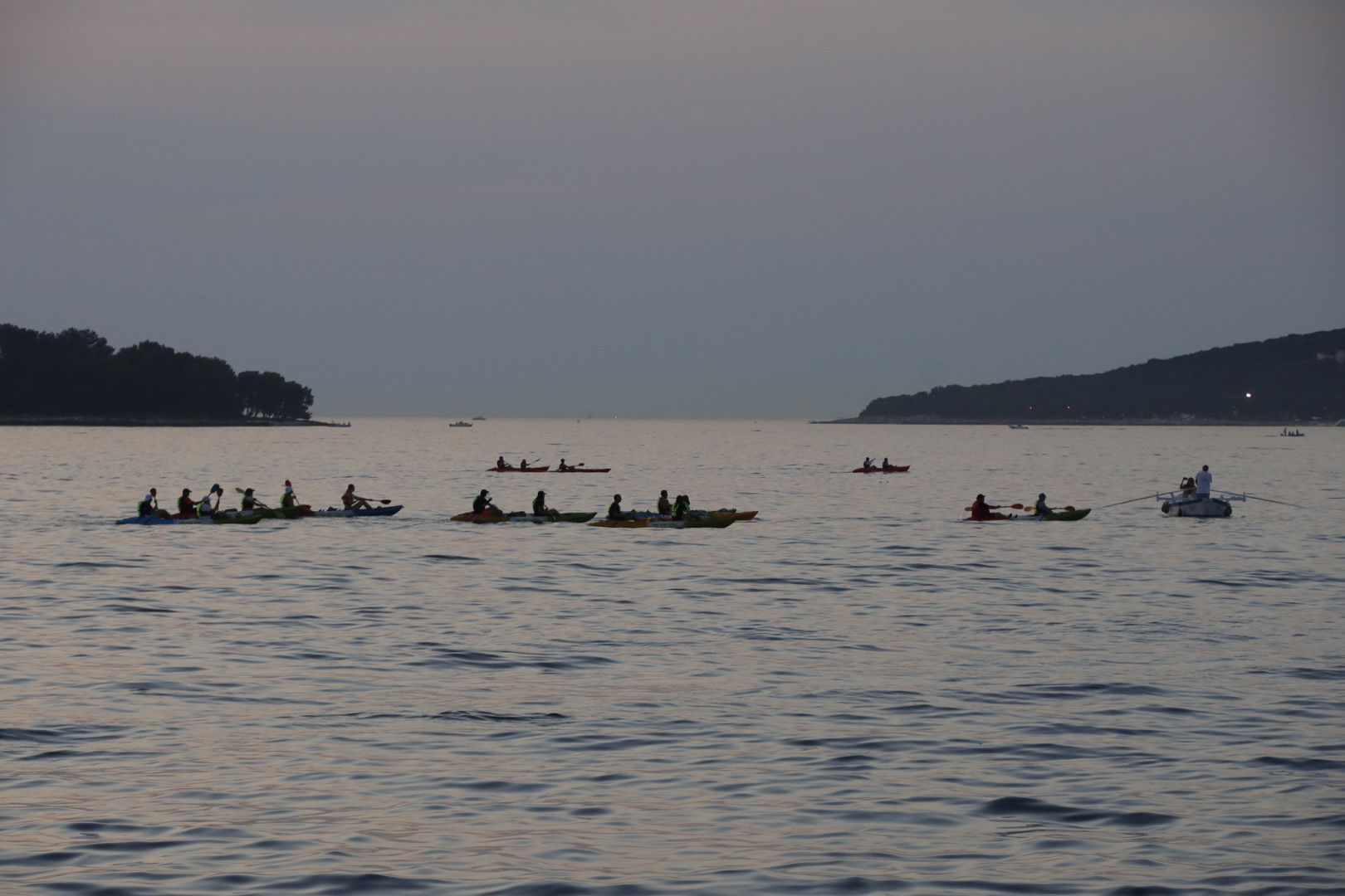 Kurz vor 18 Uhr sind wir dann wieder auf der Südseite der Stadt, wählen ein Kayak aus und starten. Zunächst peilen wir Banjol an, eine kleine Insel an, ein gutes Stück draußen - und von dort geht es in Richtung einer größeren Insel, St. Andrija. Sie wird auch „Rote Insel“ genannt, Crveni Otok. Wir paddeln weiter zur kleinen Insel Muntravo, wo nur einige Kormorane sitzen. Immer wieder sehen wir Quallen, teils auch einige Fische. Einige Zeit dachten wir, dass es nun weniger Boote gibt, die am frühen Abend noch draußen sind, aber das ist wohl nicht richtig: Als wir wieder zurück fahren, scheint es so, als seien nun deutlich mehr Boote auf dem Wasser. Die Sonne geht schon fast unter, als wir das Boot zurückgeben: Das war eine schöne kleine Bootstour am Abend und hat echt Spaß gemacht.