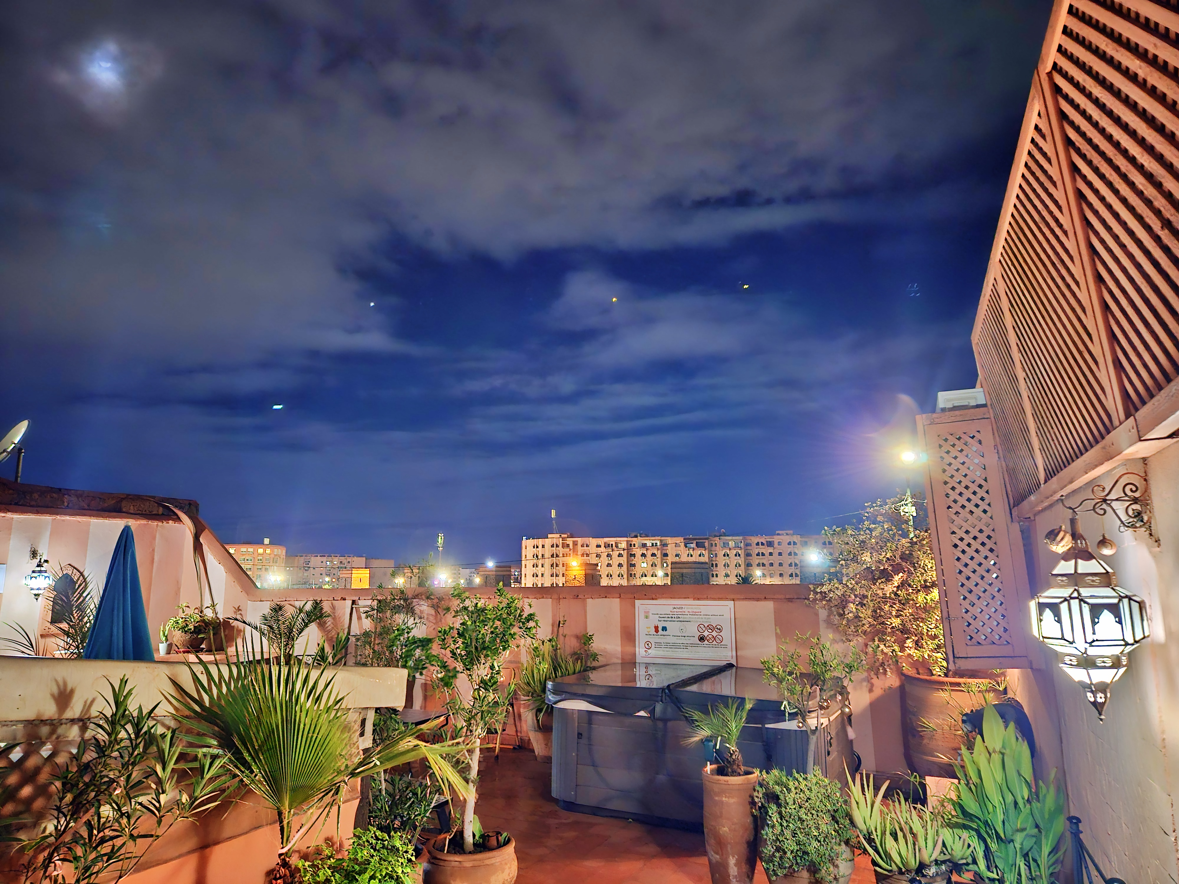 Obwohl in den Straßen recht viel Müll liegt, freuen wir uns im sehr sauberen Riad. Wir haben ein Zimmer ganz oben, das von der Klimaanlage gut geheizt ist. Auf der Terrasse vor unserem Zimmer steht auf der Terrasse ein Jacuzzi.